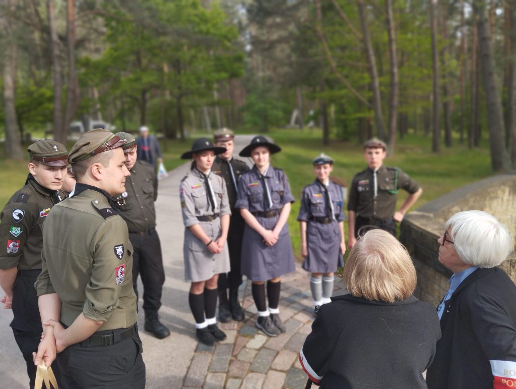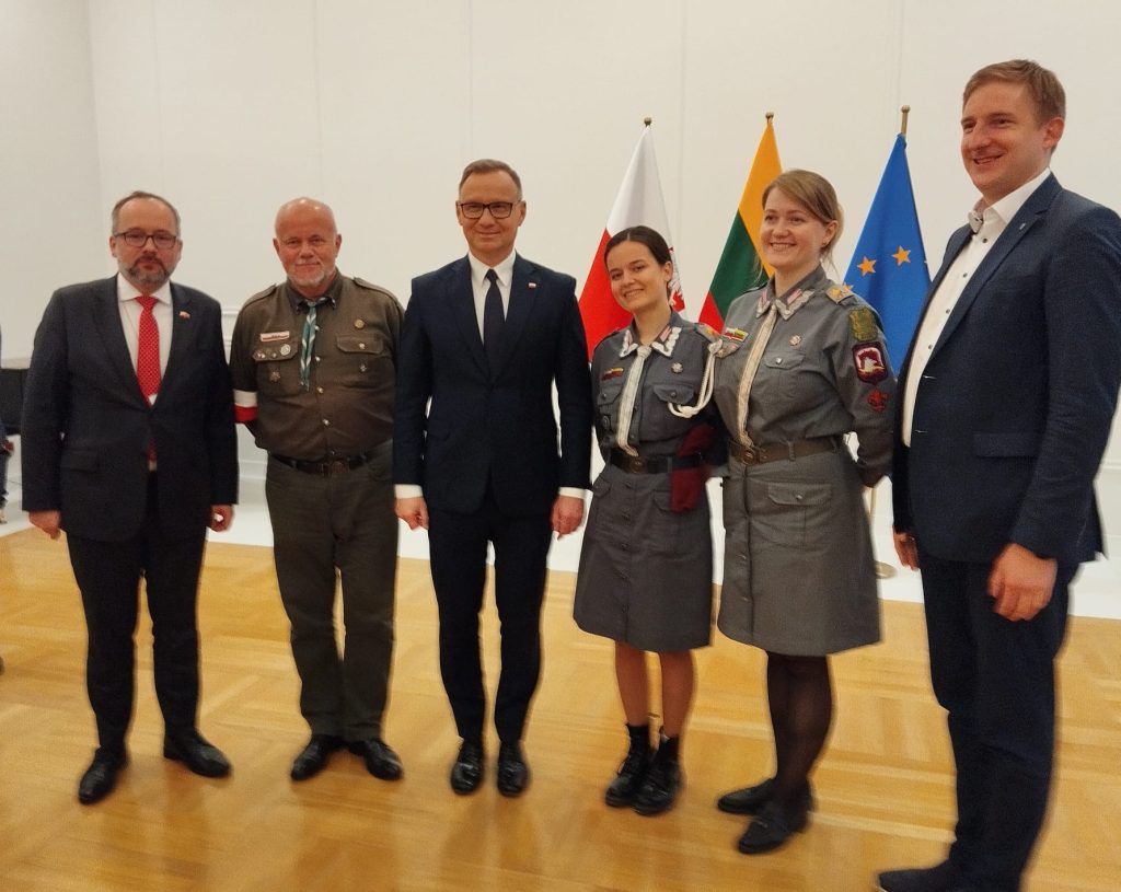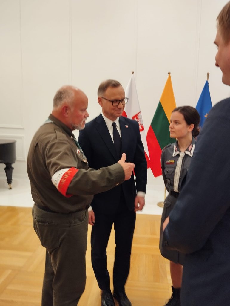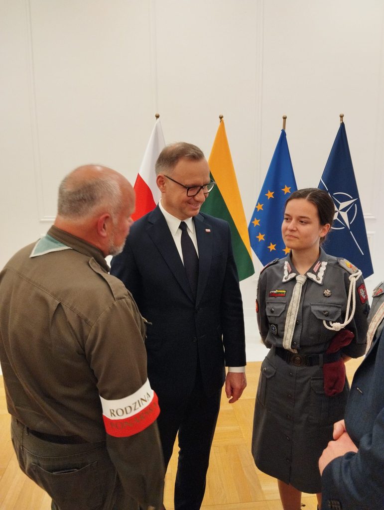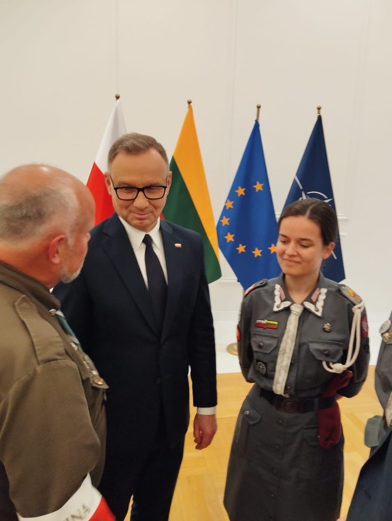Szkół Polskich na Litwie „Macierz Szkolna”. Bardzo bogaty występ Dziecięco-Młodzieżowego Zespołu „Sto Uśmiechów” został gorąco przyjęty przez wszystkich gości. Potem długo trwały osobiste spotkania i rozmowy z przedstawicielami wszystkich środowisk polskich działających na Litwie, w tym harcerzy. Wtedy też Maria Wieloch jeszcze raz podziękowała prezydentowi Andrzejowi Dudzie za wizytę w Ponarach i wręczyła mały znaczek – przypinkę z naszym logo.
