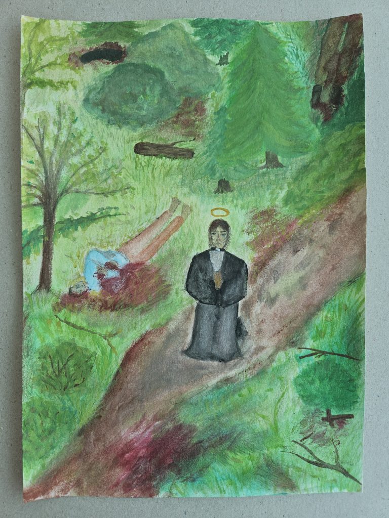 Na obrazku Emy Senczenko, która zajęła II lokatę, widzimy las ponarski w trakcie egzekucji. W centralnym punkcie klęczy kapłan w nimbie świętości, ginący za moment śmiercią męczeńską. Oprawców nie widać, ale obok księdza leży przestrzelone ciało młodego chłopca.