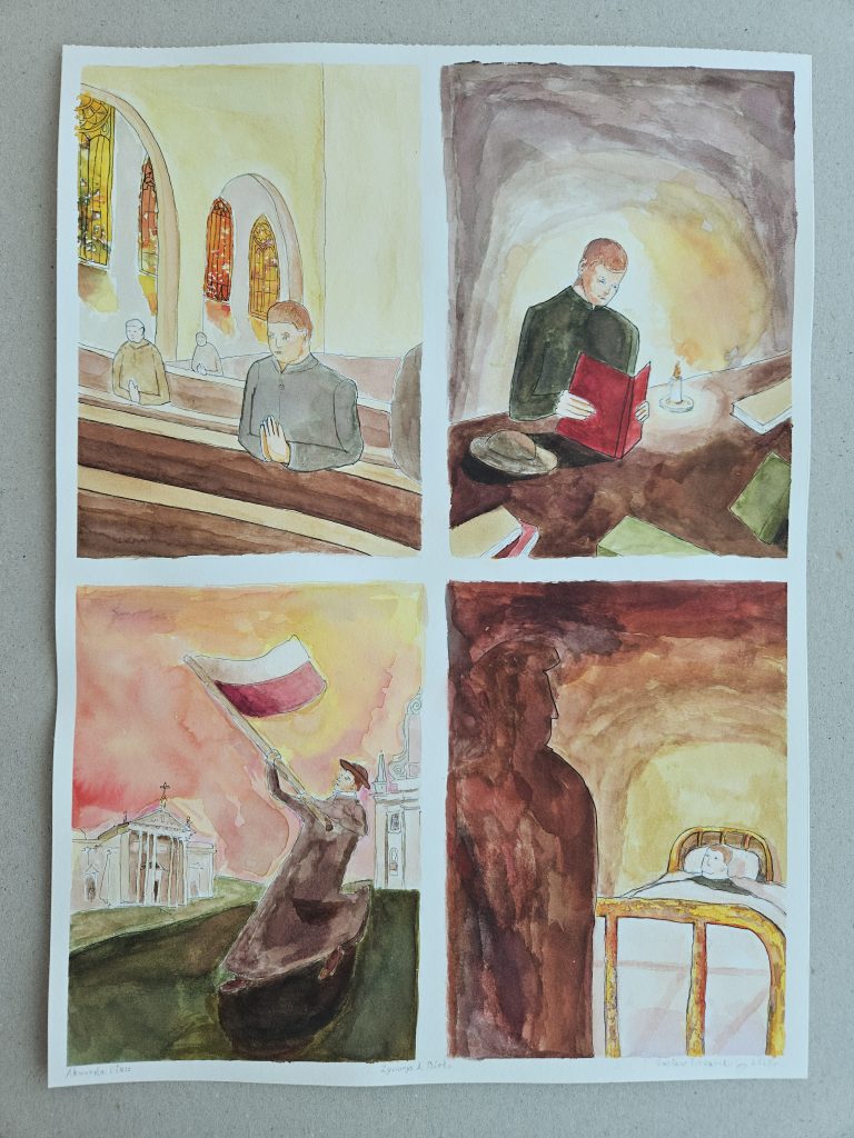 Bezkonkurencyjnie w tej kategorii zwyciężył Gustaw Piekarski, który namalował historię posługi i ostatnich chwil życia diakona Augustyna Piórko. „Autor posłużył się akwarelą w sposób wyważony, umiejętnie operuje światłem i kolorem, zestawił sceny z wewnątrz i na zewnętrz, nadając całości rytm i równowagę, tworząc czytelną i spójną narrację. Ukazuje ważne wartości duchowe i patriotyczne. Praca wyróżnia się głębokim przesłaniem, układ prowadzi wzrok widza w sposób naturalny i harmonijny, podkreśla nastrój refleksji i symboliczny charakter dzieła.” – powiedział jeden z jurorów, artysta plastyk Michał Krasodomski.
